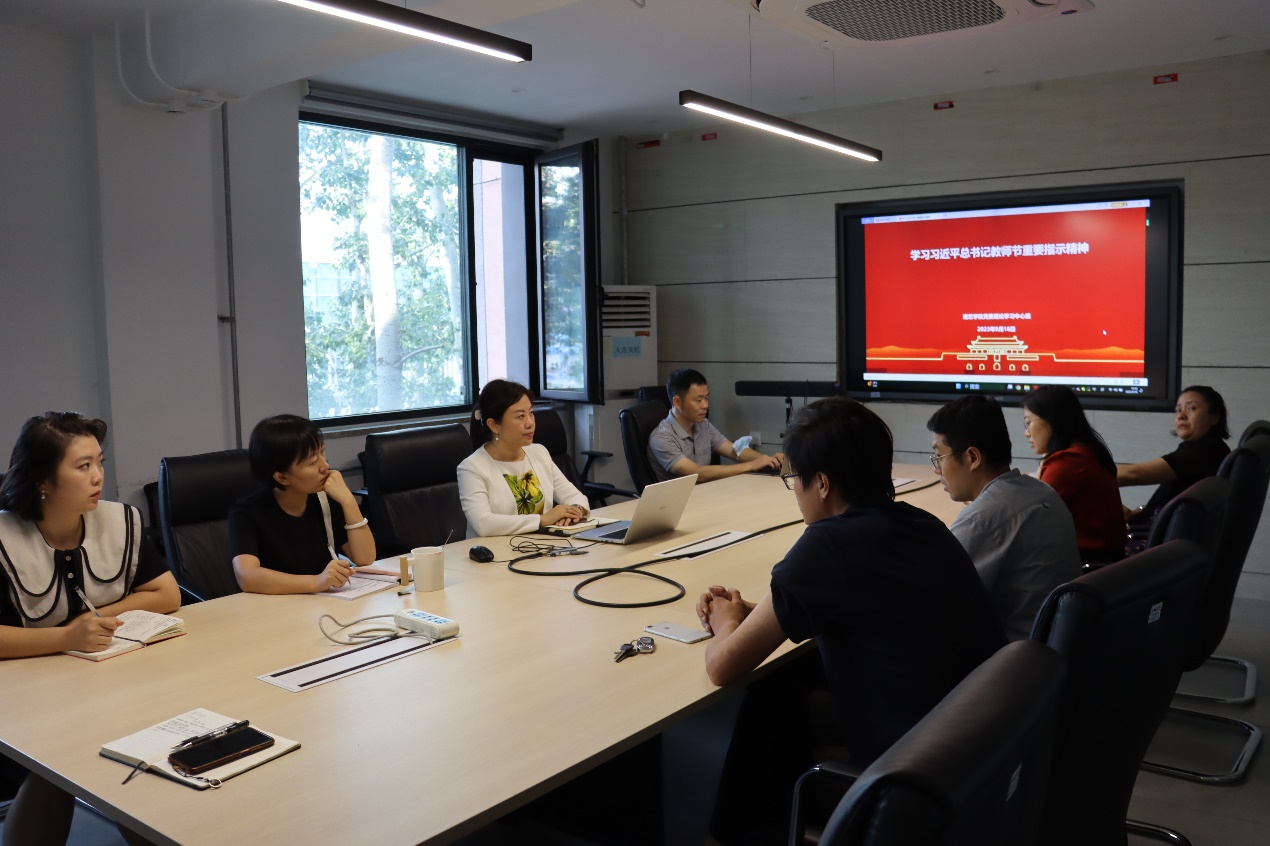 学院党委书记秦思阳带领中心组成员学习了习近平总书记重要讲话和指示,强调指出,习近平总书记在致信全国优秀教师代表中提到“教育家精神”,全院教师要认真学习精神内涵,大力弘扬和涵育教育家精神,树立“躬耕教坛、强国有我”的志向和抱负,自信自强,踔厉奋发,为强国建设、民族复兴伟业作出新的更大贡献。