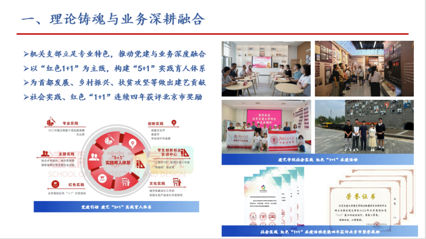 机关支部立足专业特色,以“红色1+1”为主线,构建“5+1”实践育人体系,近五年来共组建实践团队近30支,累计500余人次开展社会实践,为北京及京津冀协同发展、乡村振兴、扶贫攻坚做出了建艺贡献,实践成果丰硕,社会实践及红色“1+1”连续四年获评北京市荣誉奖励,推动党建与业务双促进。