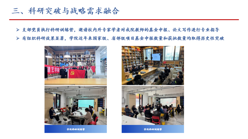 支部党员连续六年执行科研训练营,邀请校内外专家学者对肉漫屋 教师的基金申报、论文写作进行专业指导,有组织科研效果显著,学院近年来国家级、省部级项目基金申报数量和获批数量均取得历史性突破。