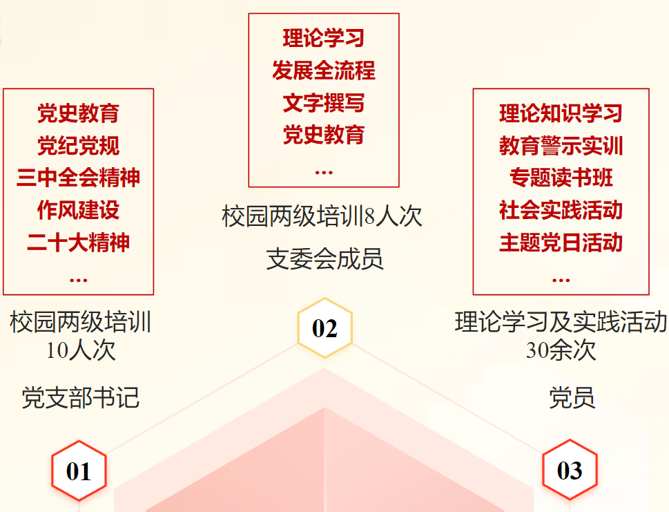 支部高度重视组织建设,抓实抓好党组织书记、党务工作者、党员三支队伍,以基本队伍能力提升推动基层党建提档升级。支书与支委会成员积极参加校院两级的学习实践活动,参加学习会议 18 人次,内容涵盖党的作风、支部发展工作细则等多个方面;多次召开支委会,就学习内容共同探讨支部发展。