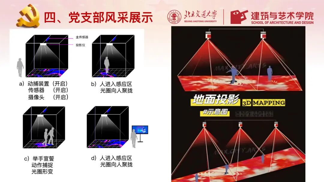 将党建与艺术设计、数字技术相结合,利用的动作捕捉和影像投影技术,制作入党宣誓与影像交互体验。