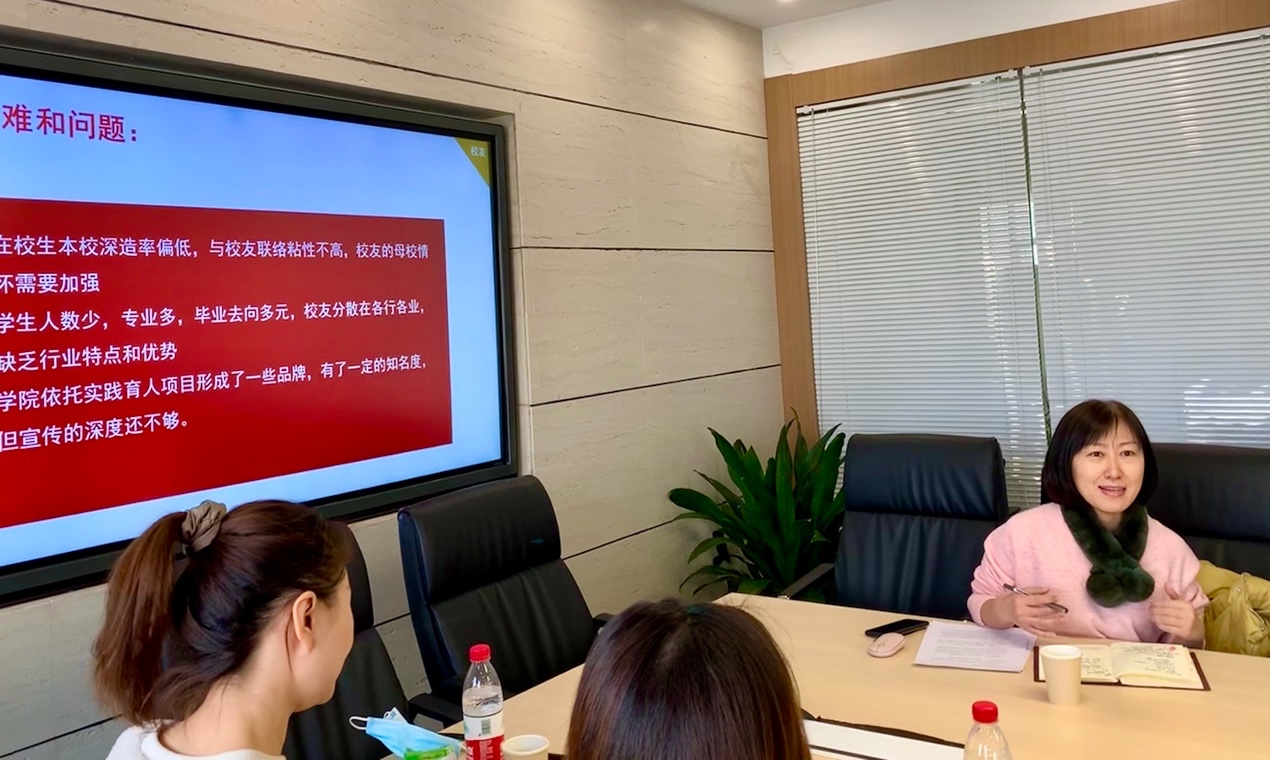 会上,刘萍从校友工作,社会服务,资金募集等角度介绍了学院外联络工作开展的整体情况,困难问题和努力方向。与会人员从校园文创产品的设计开发、校友的母校情怀培育、社会服务项目对接等方面进行了深入研讨。后续学院将继续开拓校企合作形式,凝聚校友力量,发挥美育教育实力,讲好建艺故事,塑造学院品牌,从人文情怀入手,积极提升学院的社会影响力。