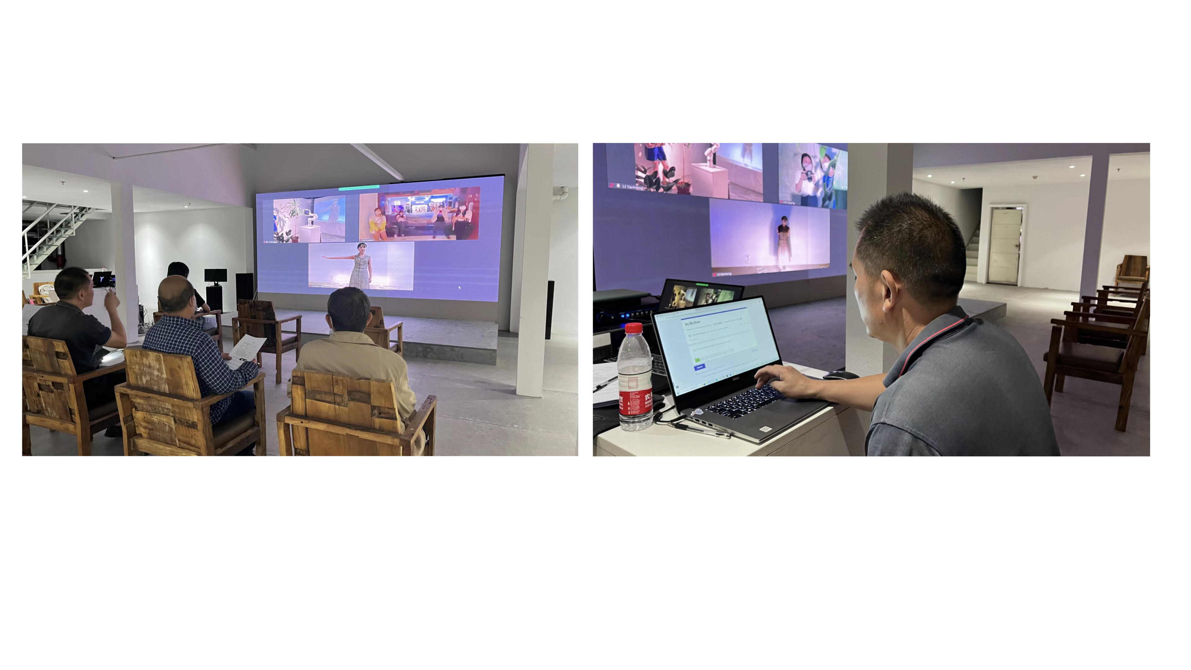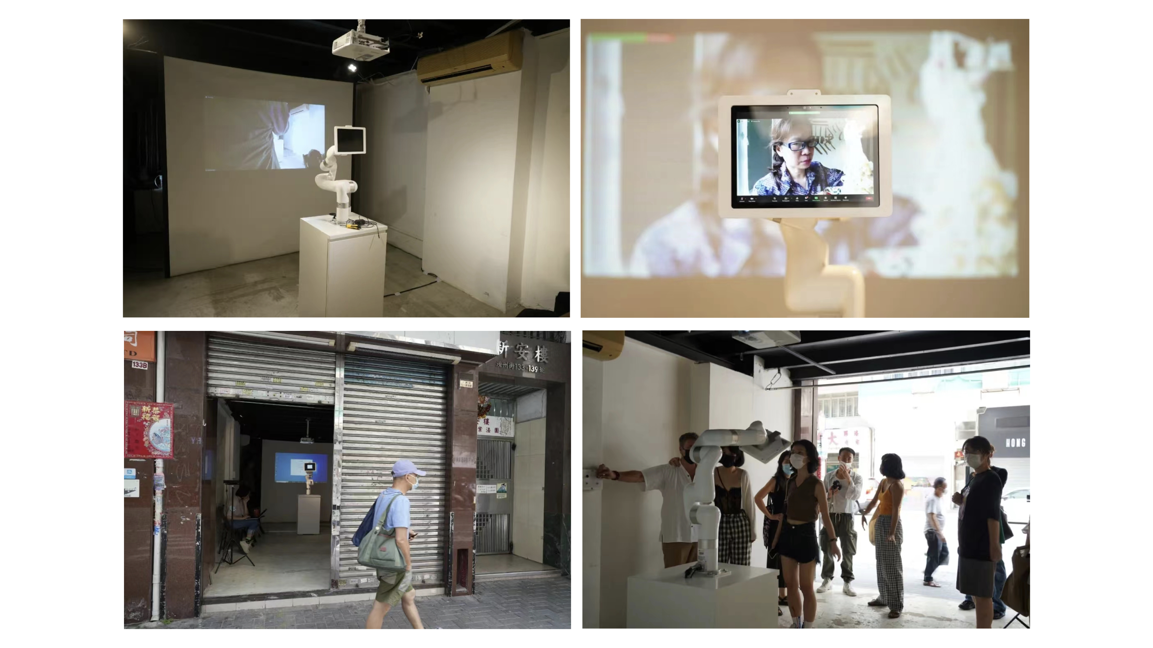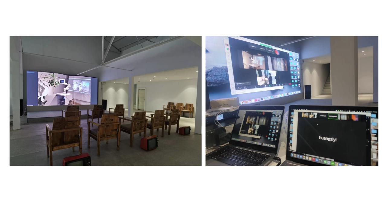 学生为此次展览的顺利实施开展了一系列展前准备,包括提前布置会场,检查音视频和交互设备,线上与香港主展区联系并调试画面,印制纸质版调查问卷等,力图为观众营造舒适观展感受,做好宣传及场内外引导工作。展览期间,大稿国际艺术区展览通过与香港主会场进行线上视频的方式,将实时内容投屏到现场进行转播。走入展区的观者会看到大屏幕上的三或四个来自不同场景的实时画面:其一是一个空屋中放置一只机械手臂,一台掌上电脑,一个投影机,除此,似乎再无它物;其二是投影机中的显屏画面,同样只有一个孤寂的人,独自吃着,独自做活,甚至独自做出种种我们绝不会在人前展示的怪动作;其三是空屋外热闹的商街,虽然行人往来落绎不绝,但行人与行人之间是陌生的,每一个行人都是单一的个体。展览中还设置了观者与表演者交互的场所,观者可以在现场调试好的交互程序上留下想对表演者说的话。