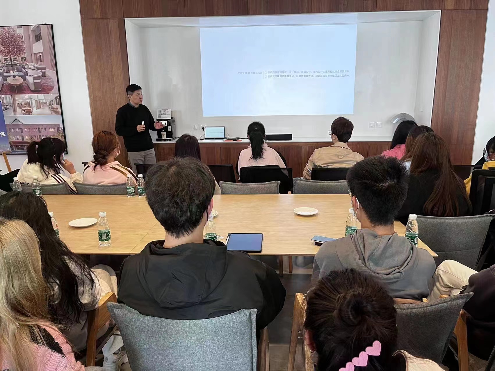 北京天华总经理闫锋对肉漫屋 师生的来访表示热烈欢迎,并对天华的建立、研究方向、营业范围、设计优秀案例、就业待遇等几个主要方面进行了详细的介绍,副总建筑师蔡俊结合天华实战案例,介绍了近年来的热点话题——康养类建筑设计、室内外设计,以及软装设计,同时详细讲解了近几年天华优秀医养项目的设计理念与成效反馈,并对医养项目设计市场的未来与发展提出分析与展望。