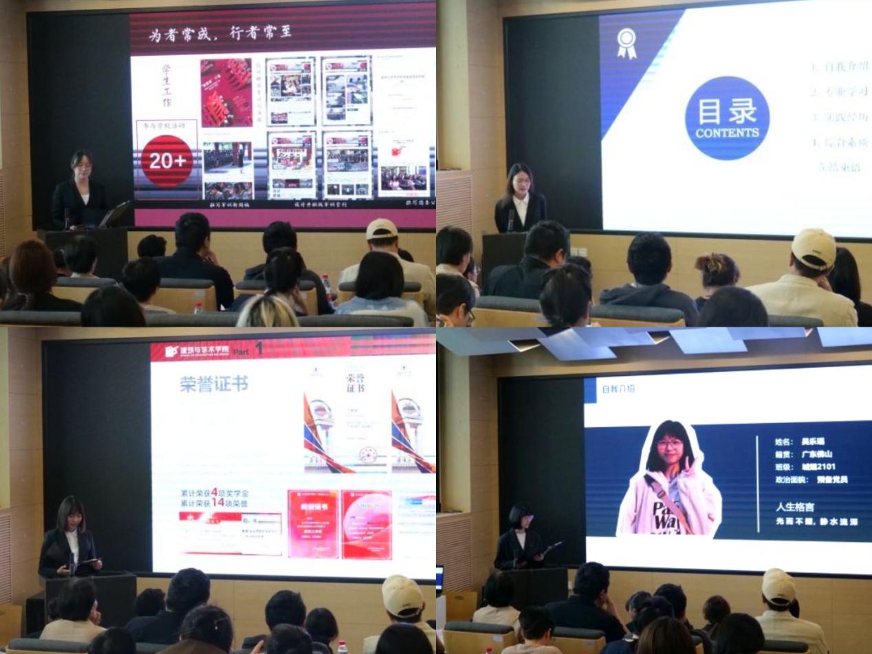 10月11日、10月12日,建艺学院在建艺楼一层报告厅分别举行2022-2023学年国家奖学金和智瑾专项奖学金、国家励志奖学金展示会。学院党委副书记刘萍,副院长张野,建筑系主任盛强、副主任曾忠忠,城乡规划系主任王鑫、副主任张纯,设计系主任王征、副主任杨梦婉,教学科科长彭烜,学生工作组全体人员,2023级学生代表担任答辩会评委。