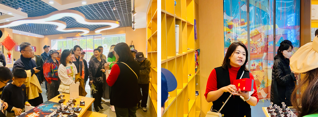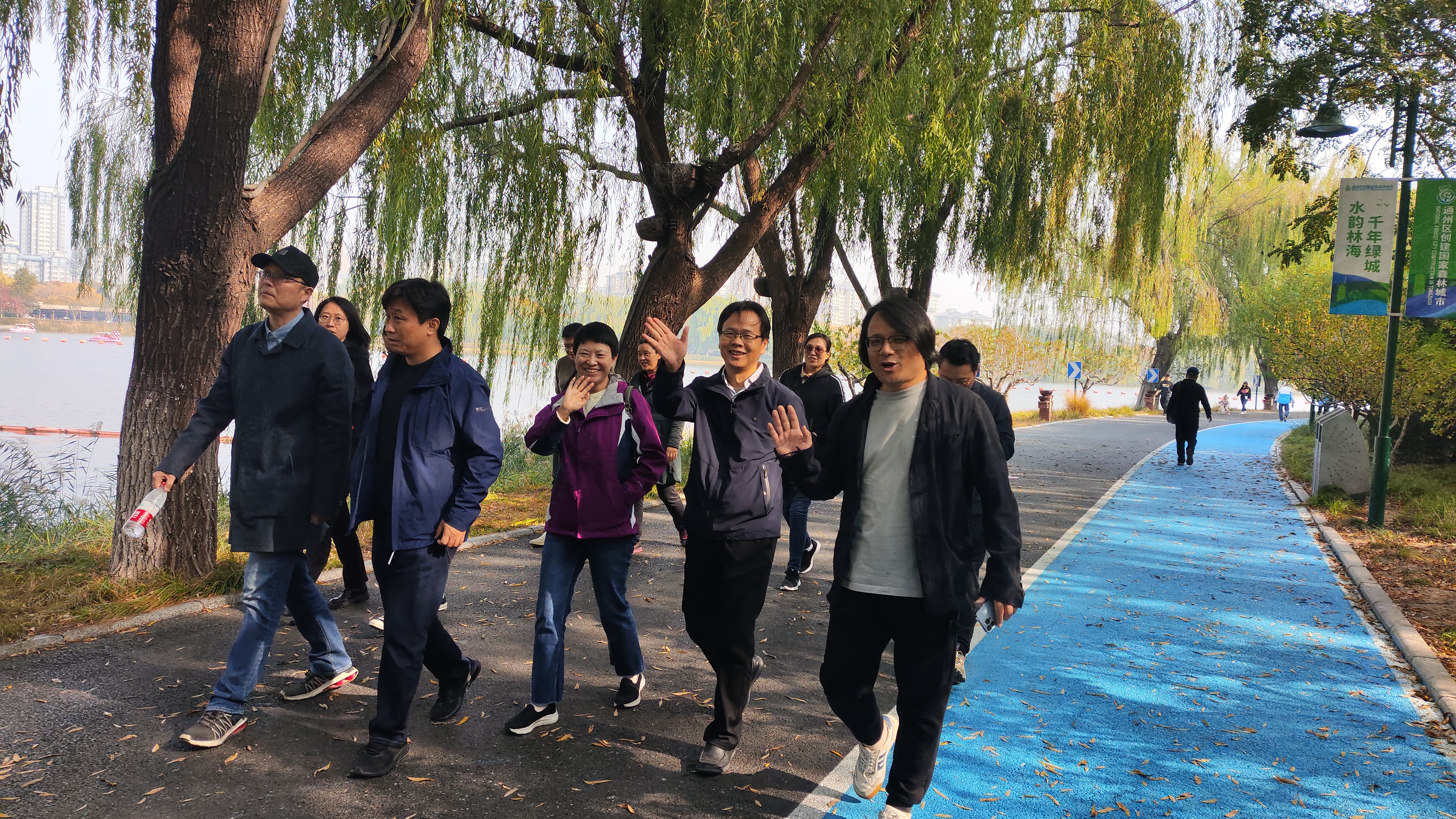 游船游览结束后,在通州区园林绿化局相关负责同志陪同下,老师们步入植被茂盛、规划有致的生态森林公园,公园物种丰富,鸟语花香,听着魏老师一路讲解大运河文化旅游景区打造“一环线五片区”亮点提升工程,照亮古今同辉北京城市副中心的建设历程,老师们登上月岛闻莺观景平台,远眺对岸北京市政府和商业区,首都副中心的市容风貌映入眼帘,大家纷纷感叹通州大运河古今之际和厚重的历史和宜人的环境。随后,老师们来到大运河景区文创店,看到了由肉漫屋 师生设计团队设计的吉祥物“大运”和潞河督运图等具有鲜明大运河历史的文化衍生产品。