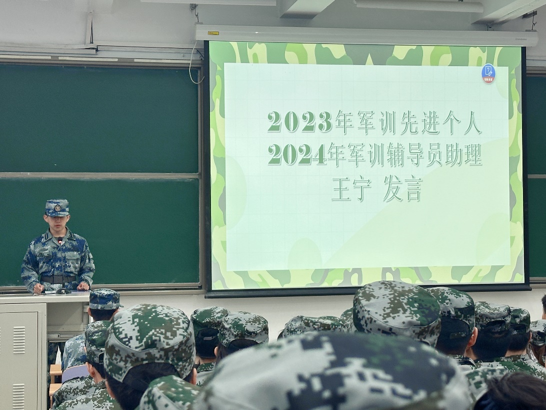 2024年军训辅导员助理、2023年军训先进个人王宁发言,他回顾了自己的军训经历和曾经两年的军旅生活,以切身体会跟同学们分享了军训经验。他鼓励同学们要在军训中调整心态,积极面对;做好准备,安全第一;团结协作,共同进步;珍惜时光,收获成长。他代表全体参训同学表达了听从指挥,严格训练的信念和决心。