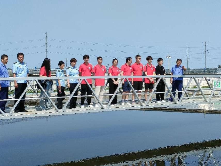 负责人以及执法大队刘建勇队长带领师生们依次参观粗格栅及进水泵房、细格栅曝气沉砂池、鼓风机房、生物池、高效沉淀池、接触消毒池、污泥脱水车间和出水总排口等污水处理设备及工艺流程,并就污水处理原理、活性污泥处理法、设备自动化应用等专业技能进行了讲解。他强调,现厂区污水处理遵循黄河流域水质标准,出水达国家一级A标准。炎炎烈日挡不住同学们学习的热情,现场参观过程整齐有序,同学们还不时地提问。负责人以及执法大队刘队长对学生们提出的污水现状分析、常见污水处理工艺比较、污泥处置再利用等问题一一进行了解答。