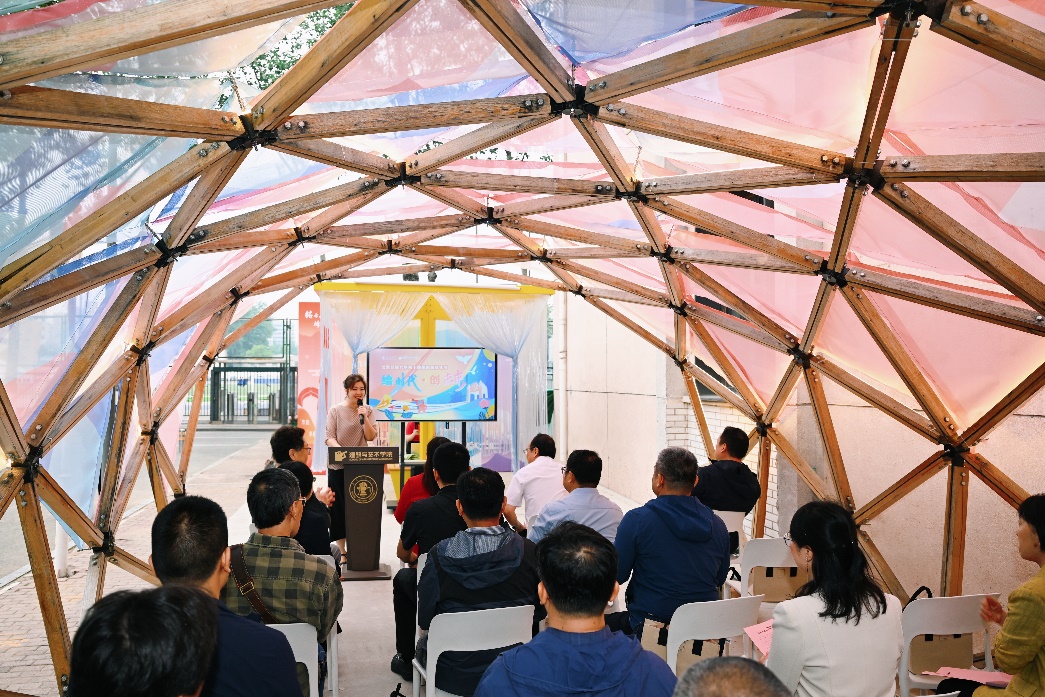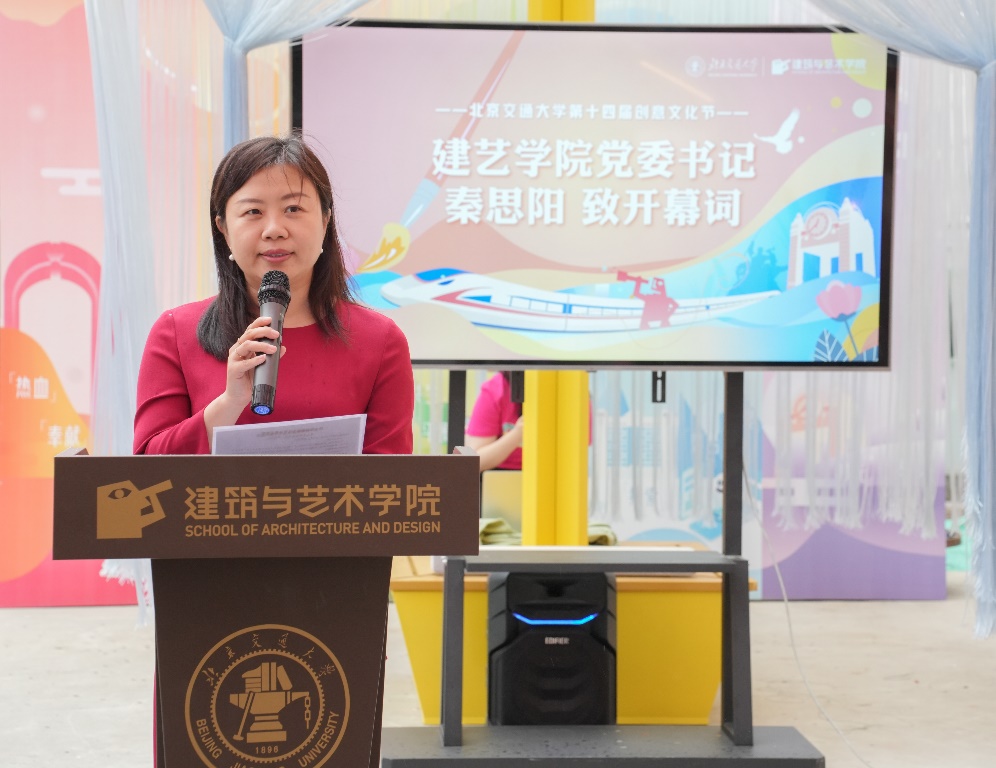 建艺学院党委书记秦思阳致开幕辞,介绍了创意文化节的三个创新点:一是发挥专业特长,开展思政教育;二是打破“被动观展”,建立“身体参与式认知”;三是运用数字技术,增强体验感。