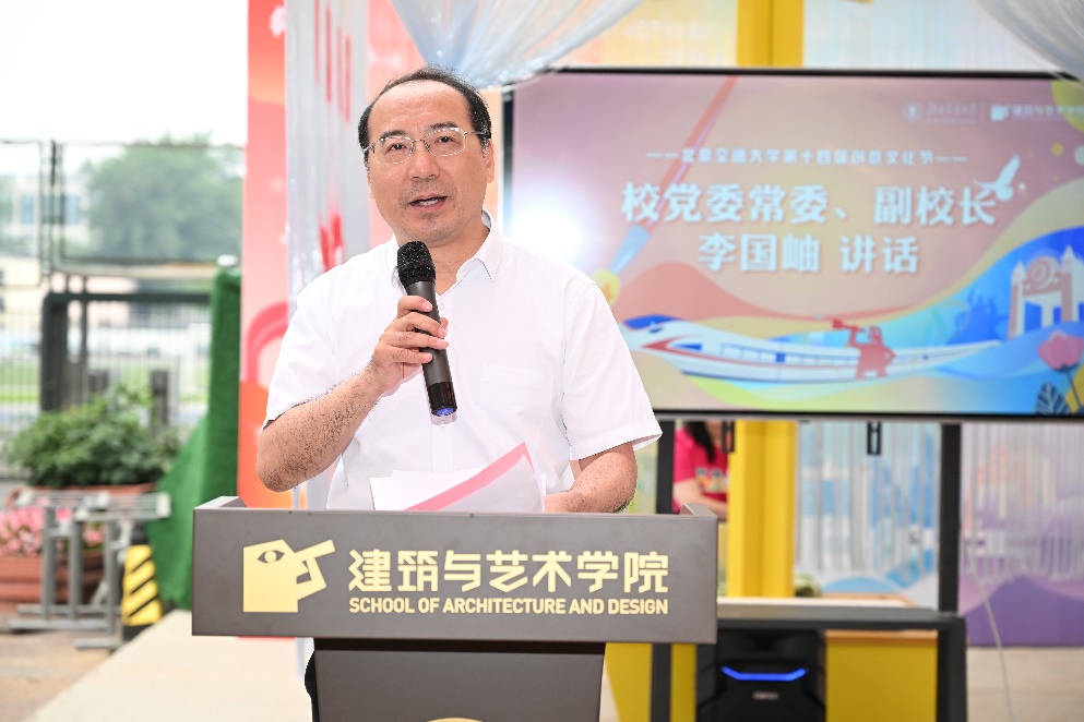 校党委常委、副校长李国岫在讲话中充分肯定建艺学院创意文化节是学校“三全育人”成果的展示,活动充分展示了建艺学院专业特色和专业优势。他提出三点希望:一是希望全体师生践行“知行”校训,不断推进文化实践;二是希望建艺学院继续推进学科交叉融合,进一步彰显交通特色;三是希望建艺学院主动作为,在大思政背景下,推动艺术与科技的融合发展。