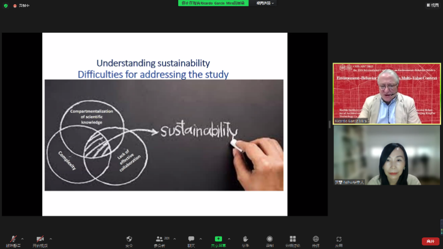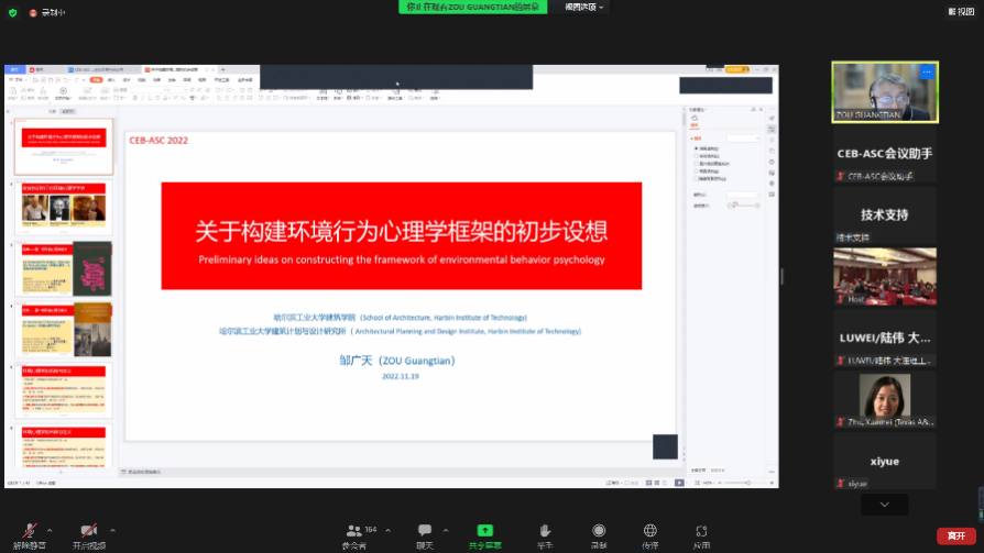 Prof. Guangtian Zou from Harbin Institute of Technology was the first keynote speaker and his presentation was titled "Preliminary ideas on establishing a framework for environmental behavior psychology". The speech reviewed the history of environmental psychology and environmental behavior, famous scholars and their classic literature, and elaborated on the importance of establishing environmental behavior psychology. Particularly, he shared his latest research on environmental behavior psychology framework and model.
