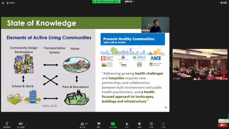 Prof. Xuemei Zhu from Texas A&M University gave the speech entitled "Design healthy buildings and walkable communities for active living". Prof. Zhu focused on the impacts of environmental design on healthy lifestyles and introduced the theoretical background, research framework, and practical needs. Her speech was focused on healthy communities, workplaces, and schools.